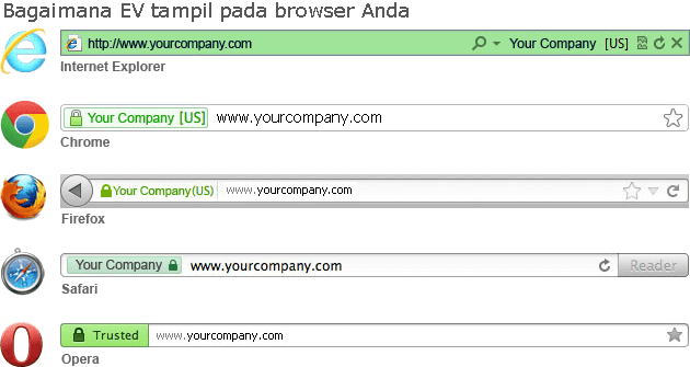 Sertifikat SSL jenis Extended Validation akan menampilkan identitas pengelola website dengan mencantumkan nama perusahaan pada address bar browser. Dengan demikian verifikasi dan keamanan akan lebih jelas terlihat bagi pengunjung website Anda.
